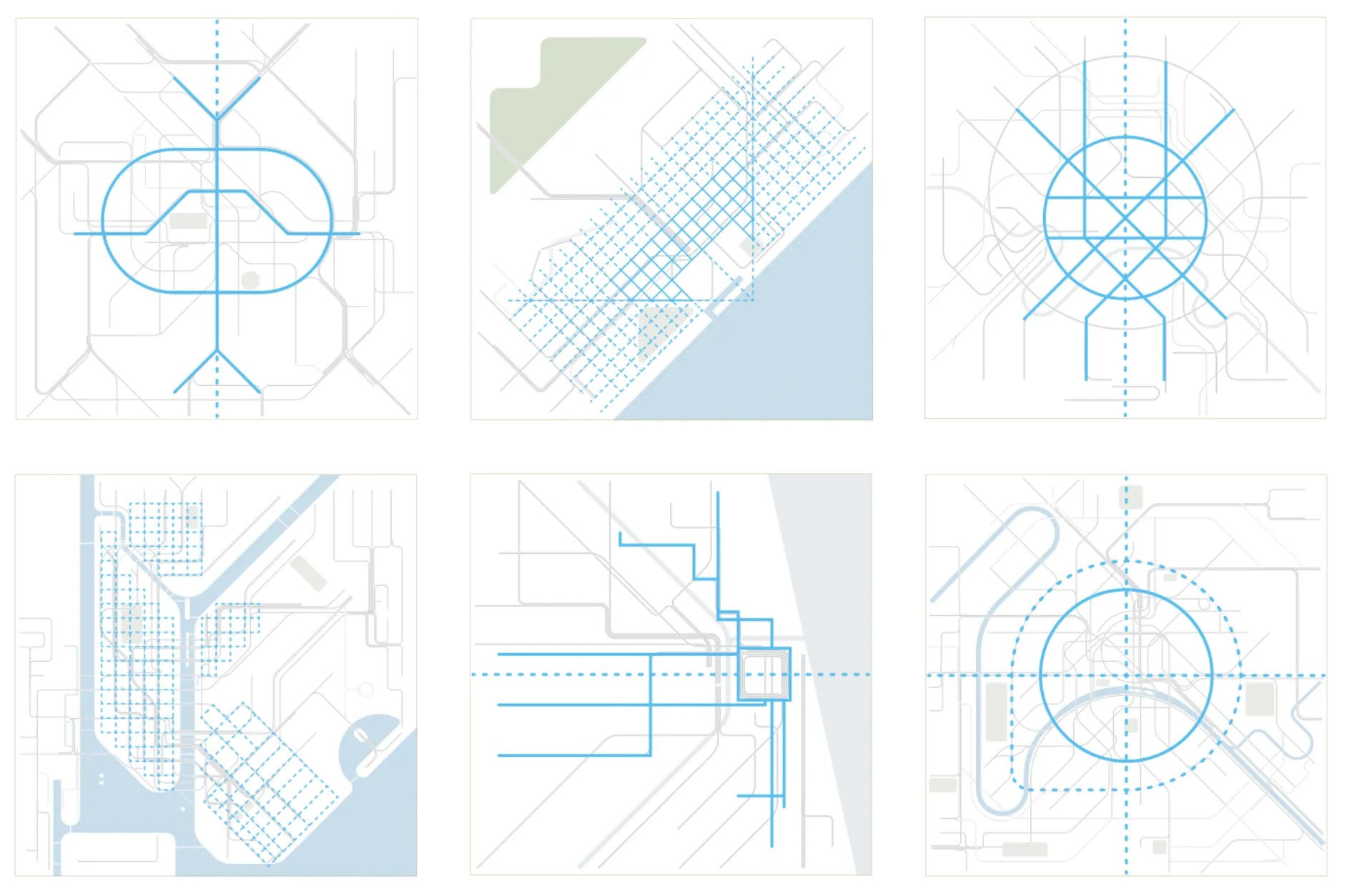 In this illustration from Jug Cerović’s book "One Metro World," you can observe schemes of highly recognizable city transit maps (from left to right, top to bottom): Berlin, Barcelona, Moscow, New York, Chicago, and Paris.